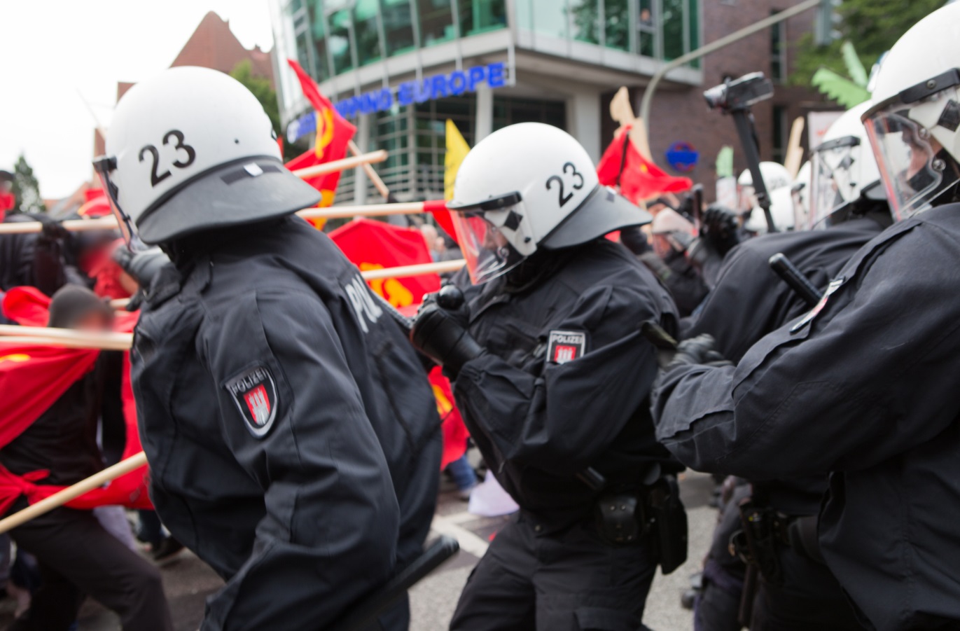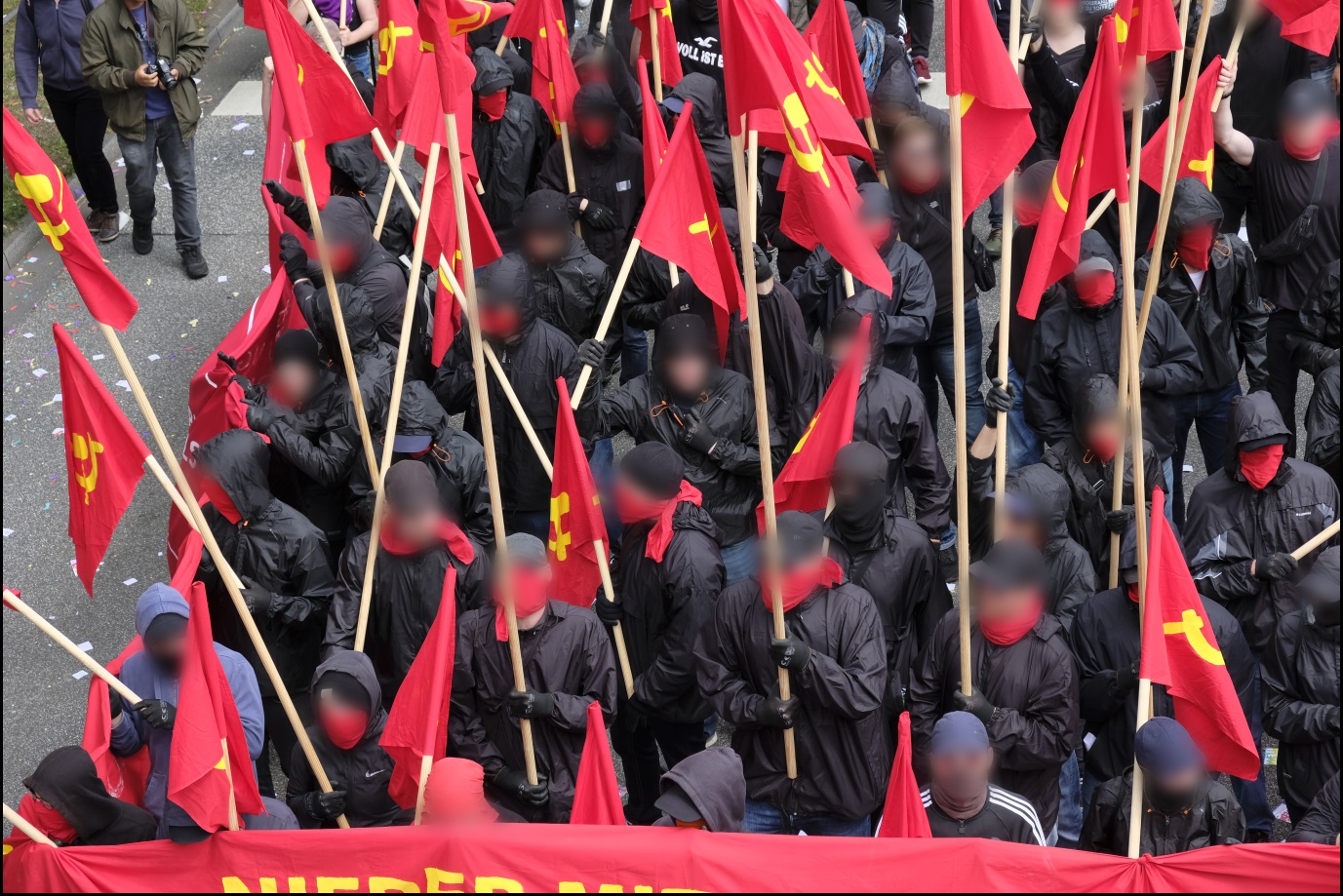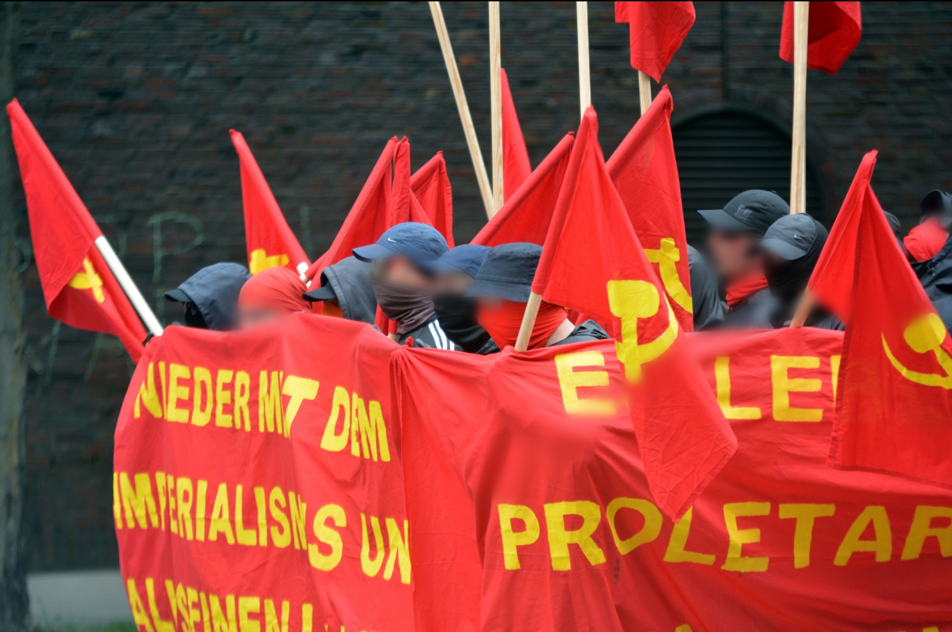 En la gran manifestación del sábado un bloque antiimperialista fue organizado en conjunto con la Alianza Contra la Agresión Imperialista de Hamburgo, que se tradujo en un bloque de frente de lucha en el que las banderas rojas con la hoz y el martillo en gran número ondeaban. Se incluyó colegas de varios países europeos. La expresión del bloque también tomó la prensa burguesa, a medida que el editor en jefe adjunto del Hamburger Abendblatt puso: “Así que muchas banderas con el martillo y la hoz que no se habían visto desde la caída del muro” (Ver Hamburger Abendblatt, “Los de negro y la izquierda “de 10 de julio 2017) De las masas del bloque antiimperialista actuaron escuadrones de propaganda, que distribuian los folletos, pegando afiche y llenaron las paredes con consignas del bloque. En este bloque se exhibieron compañeros/as de diversas y muy diferentes organizaciones lado a lado y luchaban contra el ataque masivo y preparado de la policía. Este espíritu de lucha ha impresionado a la policía lo suficiente como para que escribieran su propio comunicado de prensa: “Encontramos a algunos de los participantes embozados. De parte de este grupo se cometieron otros delitos, por lo que alrededor de 120 personas del grupo completo se separaron de la manifestación a la altura de las fuerzas policiales de la zona Herrengraben a 15:15. Los oficiales que estaban allí llegaron a ser masivamente pateados y golpeados con astas de bandera. Los participantes enmascarados pudieron escapar en todas las direccionessin ser detectados “(comunicado de prensa de la policía”, reuniones en 08/07/2017 en Hamburgo – Estación de suplementación 16:40 “) . Los periódicos burgueses informaron en varias ocasiones por ataques masivos a la policía con (banderas -) varillas. En el ataque perfído de la reacción, dos compañeros fueron tan gravemente heridos por lo que tenían que ser llevados de inmediato al hospital. Pero también se nos informa de que los “perros” fueron incapaces de completar la emboscada sin tener que pagar un cierto número con su propia sangre. Después del ataque con un espíritu revolucionario loscompañeros del bloque antiimperialista que no habían estado previamente en la primera fila, en un gran número, elevaron de nuevo la bandera roja con la hoz y el martillo y reorganizado el bloque delantero para poner fin a la manifestación combativa. Esperamos que los compañeros de otros países que han tenido la oportunidad aquí para luchar con los compañeros del bloque juntos vuelvan con un buen recuerdo de ese día para ser capaces de llevar a casa. Te damos gracias por la solidaridad que varios compañeros nos han llevado después del ataque contra la policía, pero queremos dejar claro que no estábamos víctima indefensa, pero que todos los compañeros estaban en esta lucha con una mente Clara.