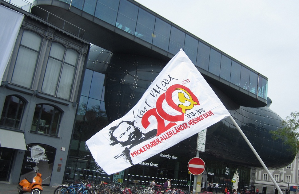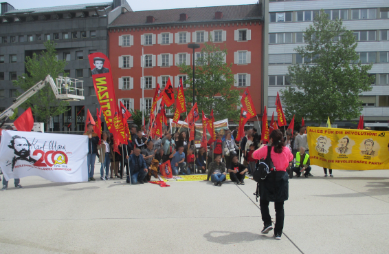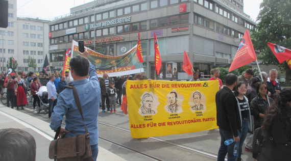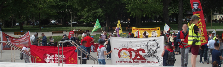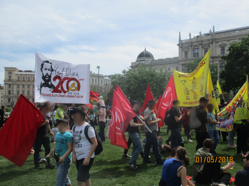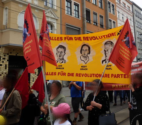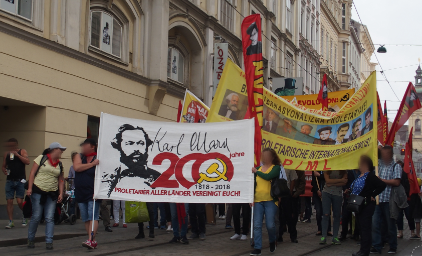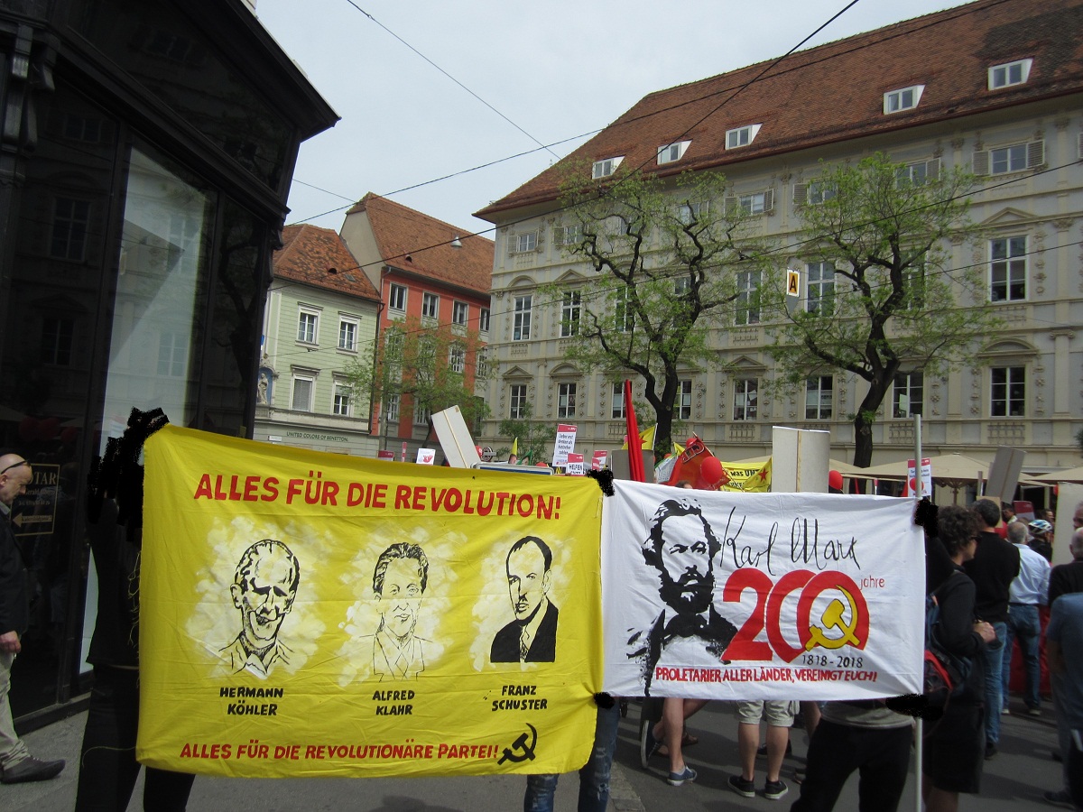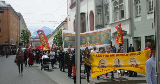 Linz – Auf der diesjährigen 1.Mai Demonstration in Linz gab es einen starken Ausdruck der maoistischen Kräfte, die gemeinsam die internationale Kampagne zum 200. Geburtstag von Karl Marx repräsentierten! Es beteiligten sich viele neue Leute, vor allem junge Aktivistinnen und MigrantInnen. Die Revolutionäre in Linz unterstützen die Einleitung einer Kampagne zu „100 Jahre Kommunistische Partei in Österreich“. Dazu wurde ein Transparent mit der Losung „Alles für die Revolution! Alles für die revolutionäre Partei!“ getragen, welches die Bilder dreier Helden des Zentralkomitees der KPÖ zeigte: Hedy Urach, Sepp Teufl und Leo Gabler! Außerdem wurden Flyer verteilt, welche im 100. Jahr der Gründung der KPÖ zur Rekonstitution der Kommunistischen Partei in Österreich aufrufen – die, so wurde berichtet, großen Anklang fanden und den AktivistInnen „aus den Händen gerissen“ wurden! Die Stimmung war im allgemeinen sehr gut und kämpferisch. Die Leute die sich beteiligten zeigten großes Interesse an Infomaterial und Flyern.