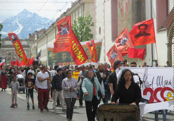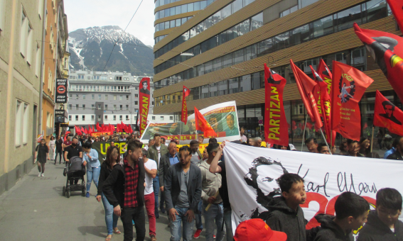 Tirol – Das Kampfjahr 2018/2019 wurde in Innsbruck mit einer großen Demonstration und Feierlichkeiten begonnen, es beteiligten sich bis zu eintausend DemonstrantInnen. Dieses Jahr stand der Kampftag der Arbeiterklasse im Licht des 200. Geburtstag von Karl Marx, sowie des 100. Jahrestages der Gründung der Kommunistischen Partei in Österreich. AntifaschistInnen, Revolutionäre und KommunistInnen trugen Transparente die diese Kampagnen unterstützten mit. AktivistInnen von Partizan haben ein Solidaritätstransparent für zwei ermordete Tikko-Kämpferinnen mitgetragen. Mit Parolen wie „Hoch die internationale Solidarität!“ und „Freiheit für alle politischen Gefangenen“ wurde eine kämpferische Stimmung in den Block getragen.