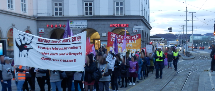 Am 8. März 2019 beteiligen sich in ganz Österreich tausende* Frauen an Aktionen, Demonstrationen und Veranstaltungen. Vor allem die vermehrten Frauenmorde in letzter Zeit haben das Anliegen der Frauen gegen reaktionäre, patriarchale Gewalt in den Vordergrund gerückt und auch die Proteste gegen die aggressive Regierung des Kapitals spiegelten sich in den Demonstrationen wieder. Besonders stachen bei den Demonstrationen in Linz und in Wien die Roten Frauenkomitees hervor, die entschlossen und kämpferisch ein starkes Kontingent an Roter Frauen mobilisierten und für eine konsequente Linie in der Frauenbewegung eintraten: Gegen Patriarchat und Kapital! Um den Kampf der Frauen zu entfesseln riefen sie mit Transparenten dazu auf, sich nicht zu isolieren, sondern sich zu wehren und zu kämpfen.
