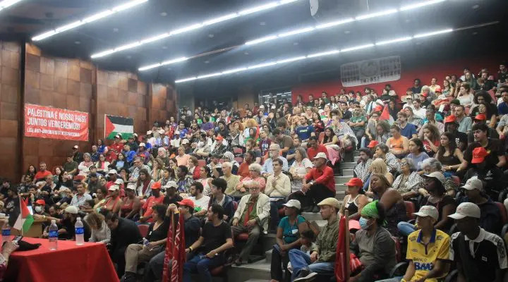 Erfolgreiche Veranstaltung gegen den Völkermord in Gaza und die zionistische Intervention auf brasilianischem Territorium in Rio de Janeiro: Mehr als 400 Menschen, darunter Bauern, Arbeiter, Aktivisten, Lehrer und Organisationen, darunter das Komitee zur Gründung der Anti-Imperialistischen Liga, versammelten sich am 27. Mai an der Universität von Rio de Janeiro unter dem Motto “Kein Schritt zurück: Stoppt die Ausrottung in Gaza und die zionistische Intervention in Brasilien!”