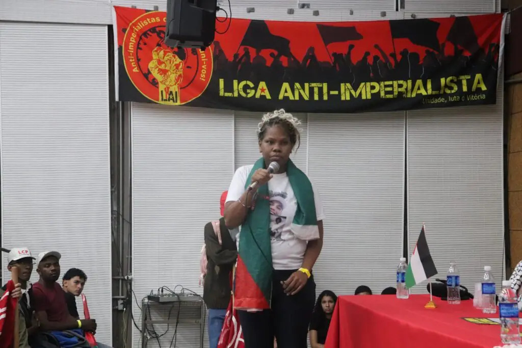 Sonia Bonfim, Vertreterin des Kollektivs der Mütter von Opfern staatlicher Gewalt, denunzierte den Parallelismus des Völkermords in Brasilien. “Der gleiche Krieg, der in Palästina stattfindet, geschieht hier in Rio de Janeiro… Wir gehen jeden Tag unter Beschuss hinaus; wir können unsere Kinder nicht zur Schule schicken”, erklärte sie. Sonia hatte eine Tochter, die von der Militärpolizei (MP) vor der Schule erschossen wurde, und verlor ihren Sohn und Ehemann durch die Hände derselben MP. “Wir nutzen den Widerstand gegen die Gewalt, und wir werden bis zum Ende Widerstand leisten”, bekräftigte sie.
