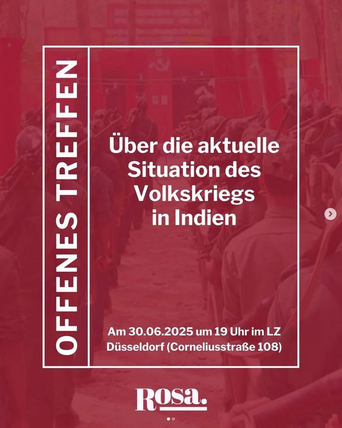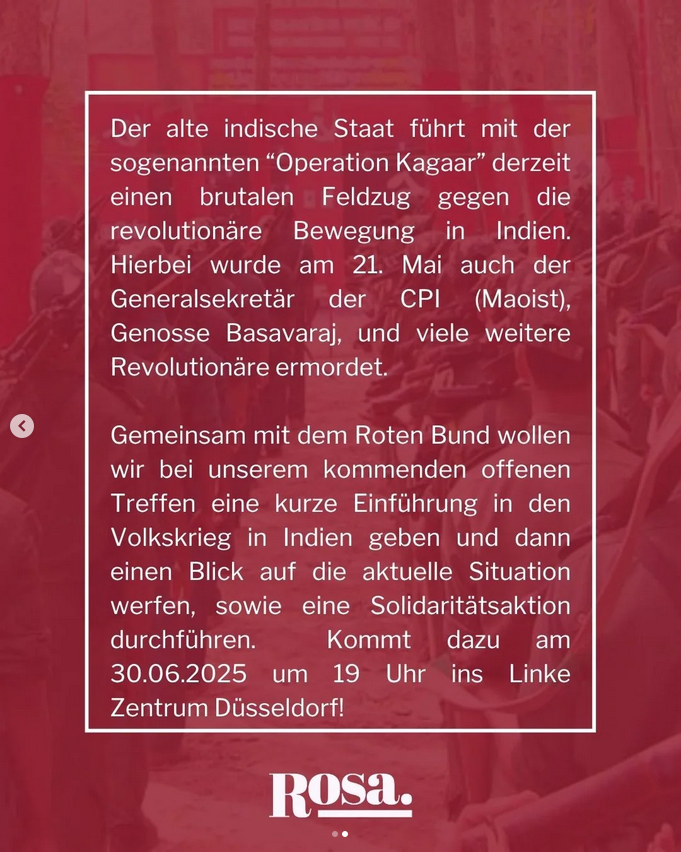 Zu Ehren des gefallenen Generalsekretärs der KPI (Maoistien) und in Gedenken an alle in Indien gefallenen Revolutionäre haben Young Struggle, Partizan und der Rote Bund dazu aufgerufen Aktionen in Solidarität mit den Genossen in Indien in den Tagen zwischen dem 27. Juni und dem 06. Juli zu organisieren oder sich an Aktionen zu beteiligen. Als Teil davon finden in Düsseldorf und Köln zwei Veranstaltungen statt in denen den Genossen gedacht wird, über die aktuelle Situation in Indien berichtet wird und gemeinsam Solidarität zum Ausdruck gebracht werden wird.