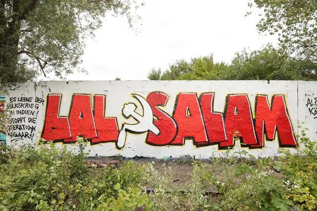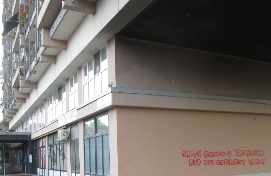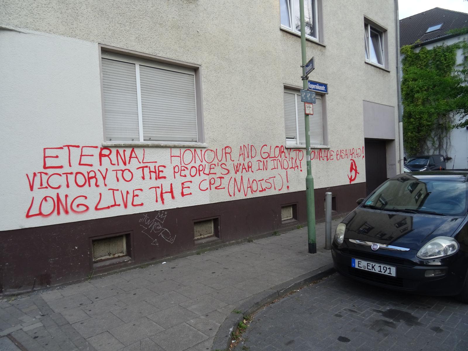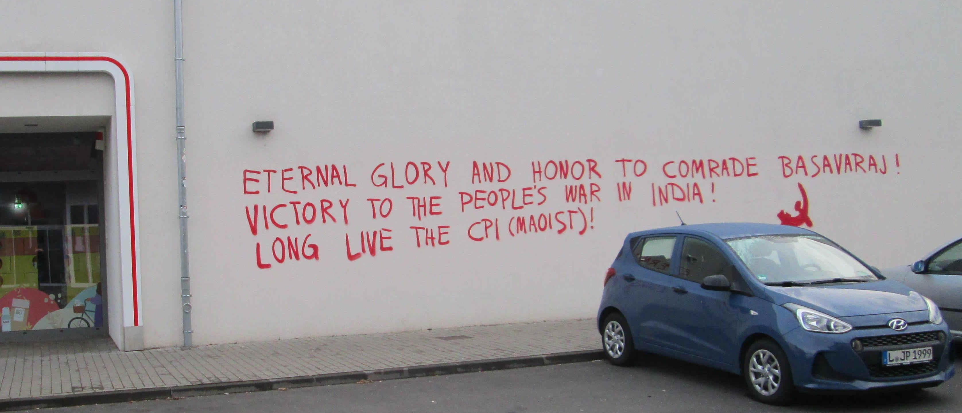 Auch von Aktivisten des Roten Bunds wurden diverse Aktionen in verschiedenen Teilen des Landes verwirklicht. Es erreichten uns Berichte aus Dortmund, wo ein Mural mit dem Portrait des Genossen Basavaraj und Parolen in der Nordstadt gemalt wurde, sowie aus Freiburg, wo große Wandzeitungen mit dem Konterfei des ermordeten Generalsekretärs der Kommunistischen Partei Indien (Maoistisch) in den Stadtteilen Unterwiehre, Stühlinger und Vauban aufgehängt wurden. Wir erhielten auch Bericht über Dazibaos in Leipzig.