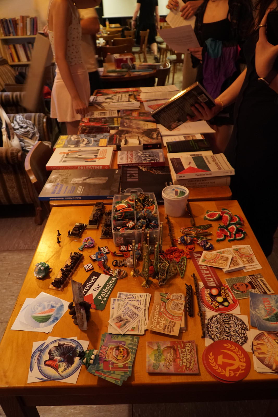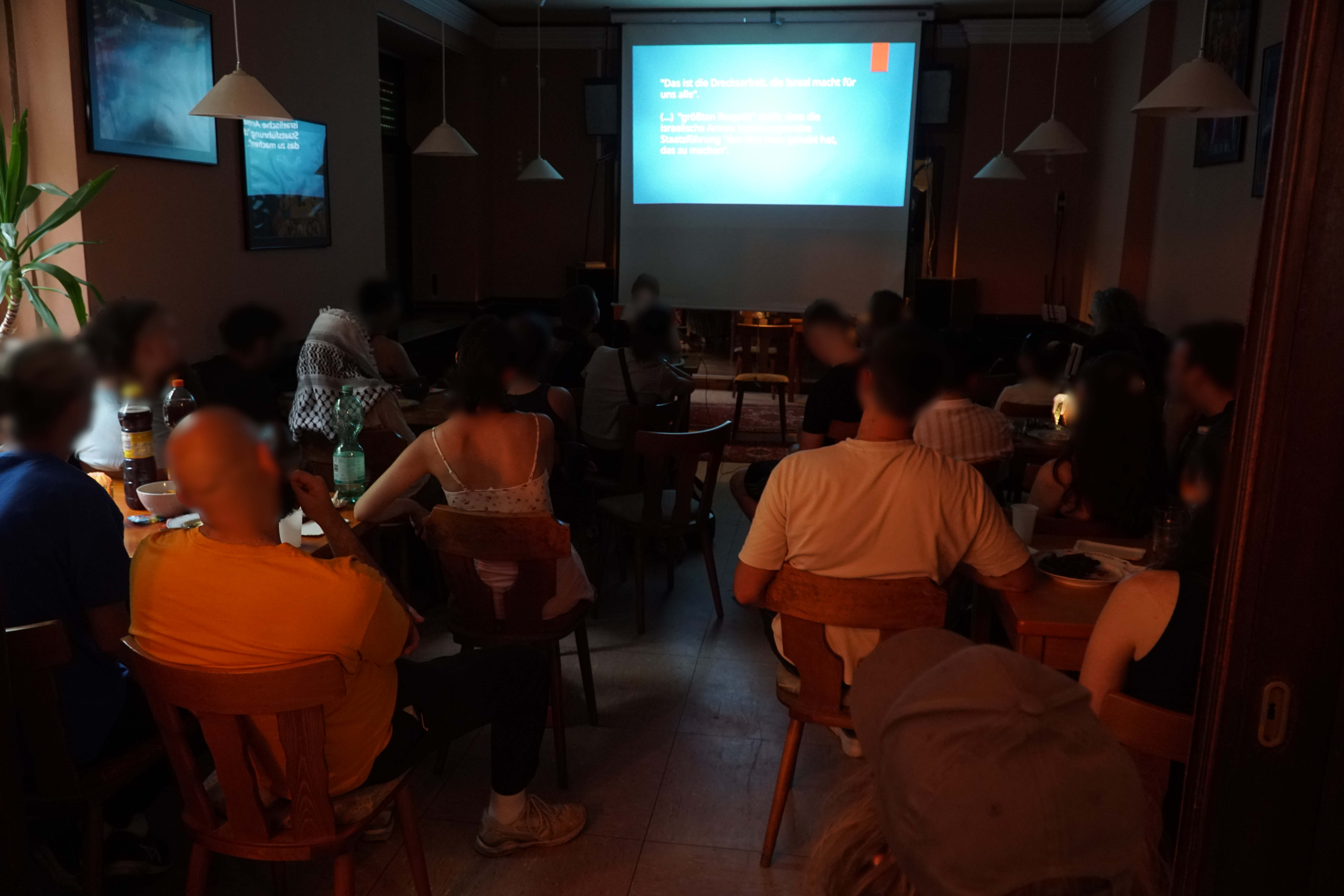 Gemeinsam, mit internationalistischer Musik und arabischem Essen, wurde im Anschluss an die kurze Einleitung lebendig die aktuelle Situation im Nahen und Mittleren Osten, die Rolle der Imperialisten und die Funktionsweise von Opportunismus und Revisionismus innerhalb der revolutionaristischen und palästinasolidarischen Bewegung diskutiert, Infomaterial wie Anhänger, Sticker und Rote Post verbreitet und zu weiteren Veranstaltungen im Taranta Babu mobilisiert.