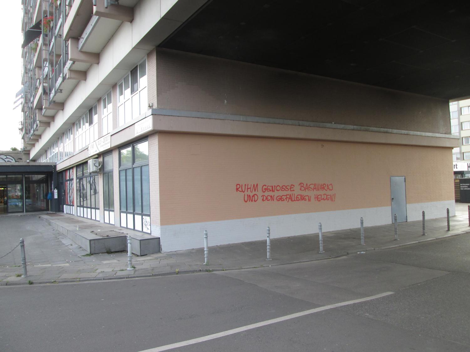 Neben den Slogans “Ewiger Ruhm und Ehre dem Genossen Basavaraj!“, „Ruhm dem Genossen Basavaraj und den gefallenen Helden!“ und „Sieg dem Volkskrieg in Indien!“ wurde unter anderem auch das Plakat der gemeinsamen Kampagne mit dem Konterfei des ermordeten Generalsekretärs der Kommunistischen Partei Indien (Maoistisch) geklebt. Im Folgenden dokumentieren wir aufnahmen dieser Aktionen die wir zu gesendet bekommen haben: