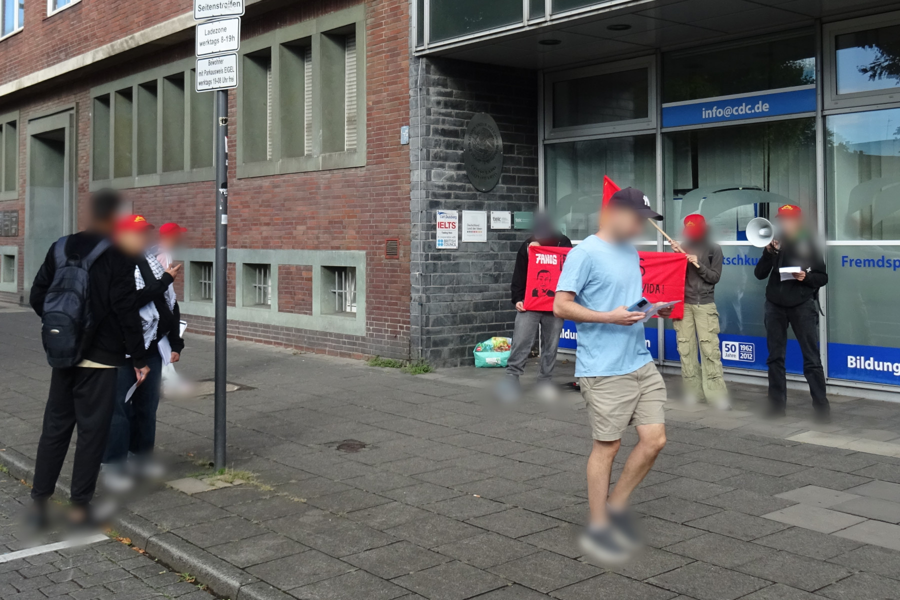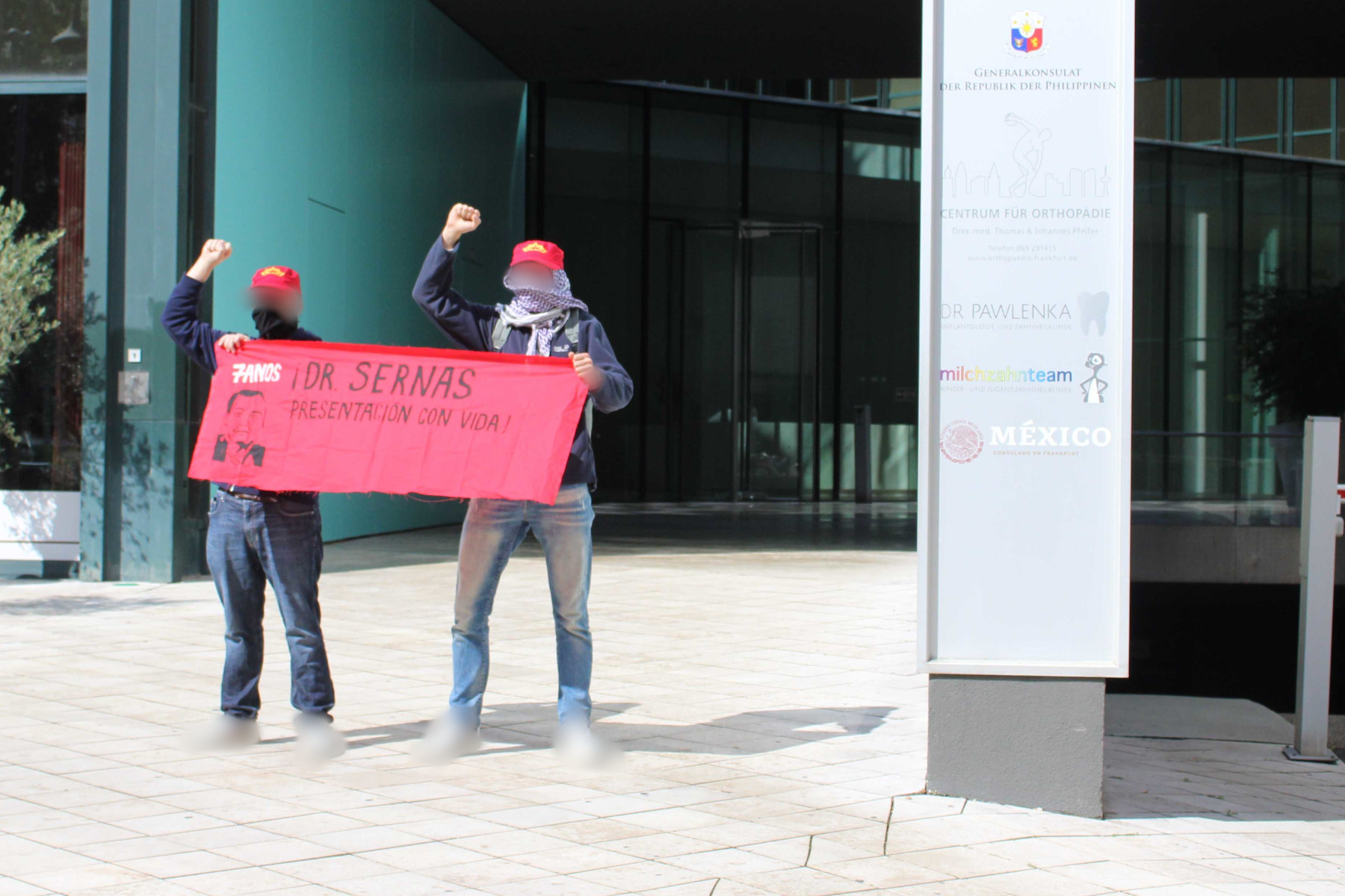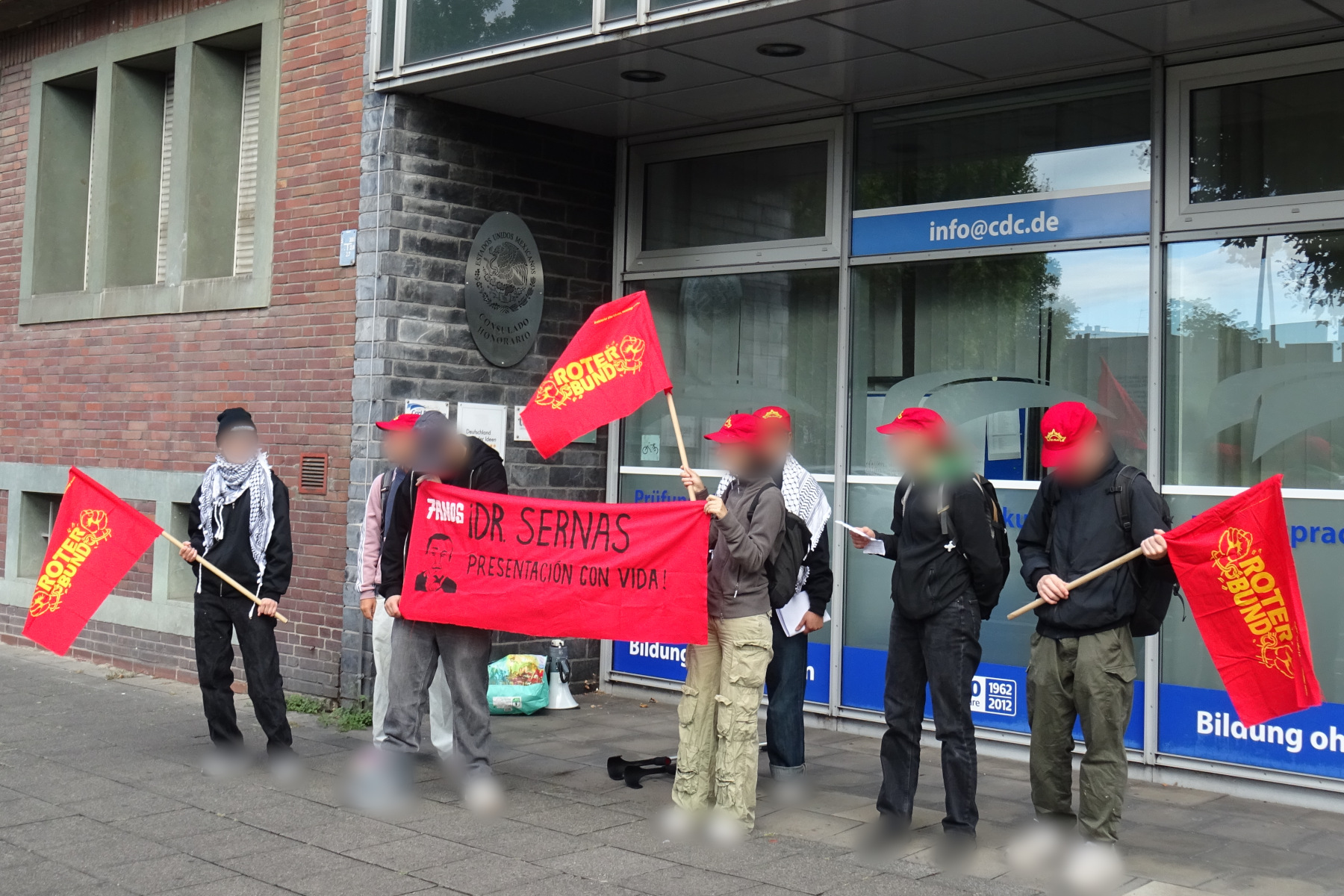 Vor dem mexikanischen Honorarkonsulat in Köln wurde eine Kundgebung gehalten, sowie auch vor dem mexikanischen Konsulat in Frankfurt. In Köln beteiligten sich die Aktivisten des Roten Bundes anschließend an der “Rheinmetall Entwaffnen”-Demonstration und währenddessen war ein Kontingent in Frankfurt auf einer Palästina-Demonstration. Das Wochenende fand seinen Abschluss mit dem monatlichen Vortrag in Köln. In all diesen Aktionen, egal ob auf Bannern, Flugblättern oder Schildern, hieß es: “#DrSernasPresentaciónConVida”