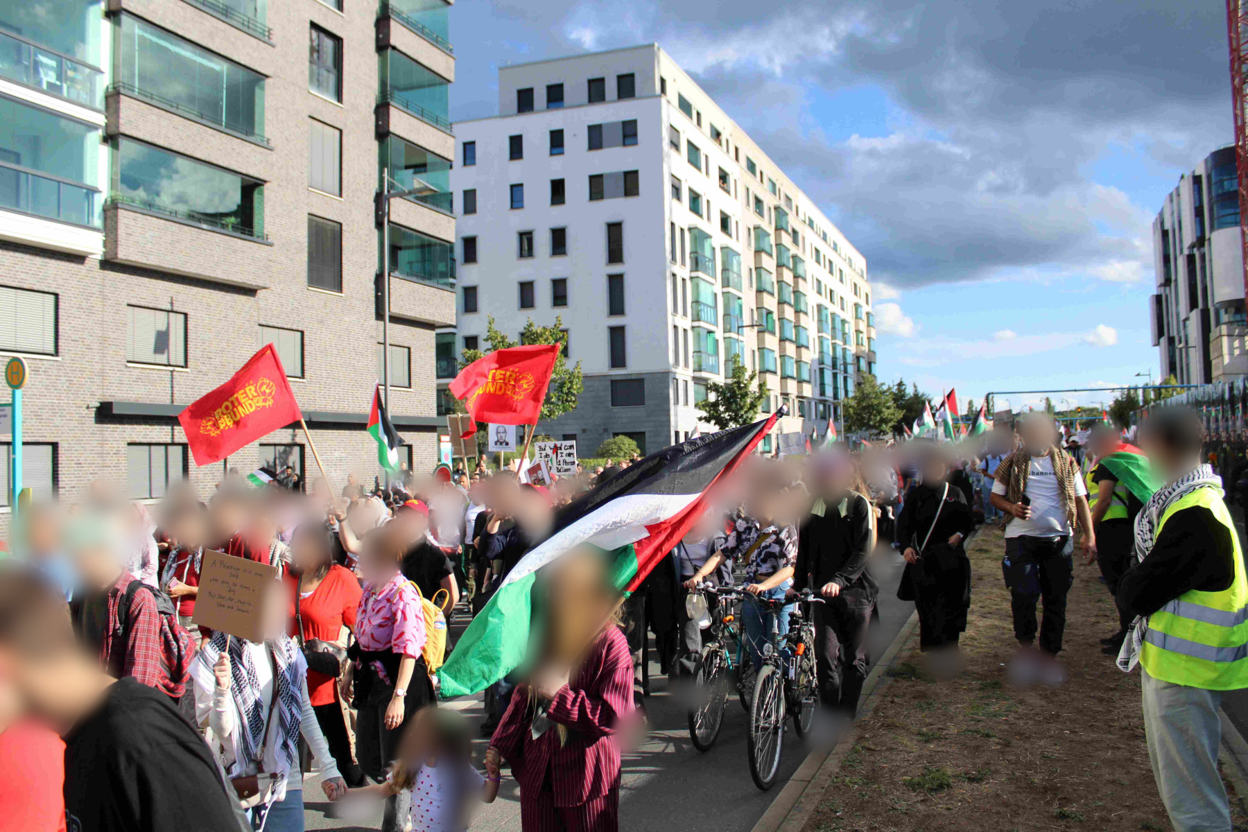 Als vierte Aktion an dem Wochenende beteiligte sich der Rote Bund NRW an der “Rheinmetall Entwaffnen”-Demonstration in Köln und thematisierte auch dort den Aktionstag zur Forderung der lebendigen Präsentation des Genossen Ernesto Sernas Garcia. Die Demonstration mit mehr als 3000 Teilnehmern wurde vom Beginn an unter fadenscheinigen Vorwänden von der Polizei kriminalisiert. Der Aufzug wurde durch die Polizei aufgelöst und über 700 Menschen in einem Polizeikessel festgehalten. Zum Teil für über 10 Stunden wurde den Teilnehmenden ihre Grundrechte verwehrt und selbst Personen in einer akuten medizinischen Notlage wurde nur mithilfe großer Protestbekundungen der Zugang zu einer ärztlichen Versorgung im Krankenhaus erlaubt.