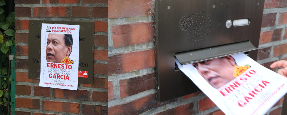 Am 30.8., dem Tag der Verhafteten-Verschwundengelassenen, führten Aktivisten des Roten Bundes auch in Hamburg vor dem mexikanischen Konsulat eine Aktion durch, die die lebendige Präsentation von Genosse Ernesto Sernas Garcia forderte.