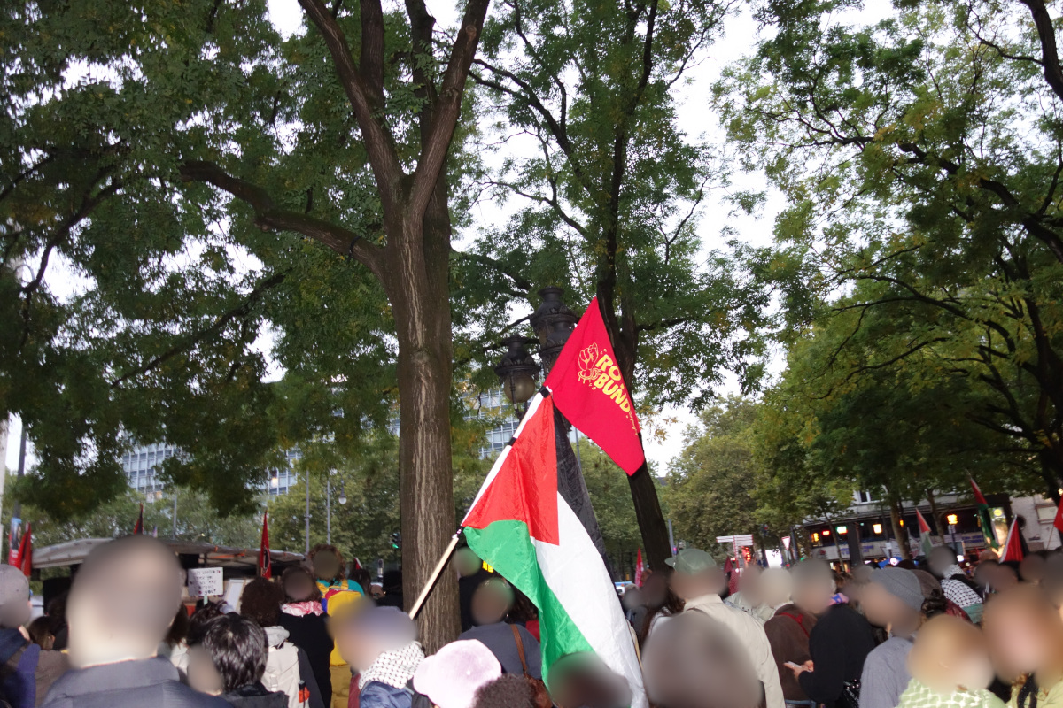 Am 7. Oktober beteiligte sich ein Kontingent des Roten Bundes in Köln an einer Demonstration aus Anlass des fortgesetzten Genozid am Volk von Palästina und dem Jahrestag der Militäroperation der nationalen Widerstandsfront Palästinas gegen die israelische Besatzung vor zwei Jahren. Dafür versammelten sich trotz Regen und Wind gut 600 Menschen am Rudolfplatz um mit zahlreichen Schildern auf die neusten Massakern in Gaza, den Menschenrechtsverletzungen gegen die Gaza Sumud Flottila und die Ablehnung des Imperialismus im Allgemeinen aufmerksam zu machen.