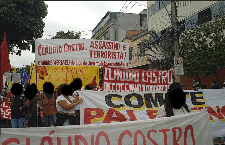 Die Demonstranten hielten Transparente und Schilder hoch, auf denen sie die andauernde Politik des Völkermords an der Bevölkerung anprangerten, die sich während der Amtszeiten von Claudio Castro, der für die beiden größten Polizeimassaker in der Geschichte von Rio de Janeiro verantwortlich ist, noch verschärft hat.
